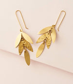 These handcrafted drop earrings feature lightweight leaf charms in a refined, tiered design with gold finish. Dimensions: 3.5" L x 1.25" W All of Matr Boomie's collection is handmade, fair trade and sustainable.