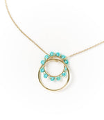 This handcrafted hoops pendant necklace features one shiny gold finish hoop and one gold finish hoop wire wrapped with faceted turquoise glass seed beads fringe.