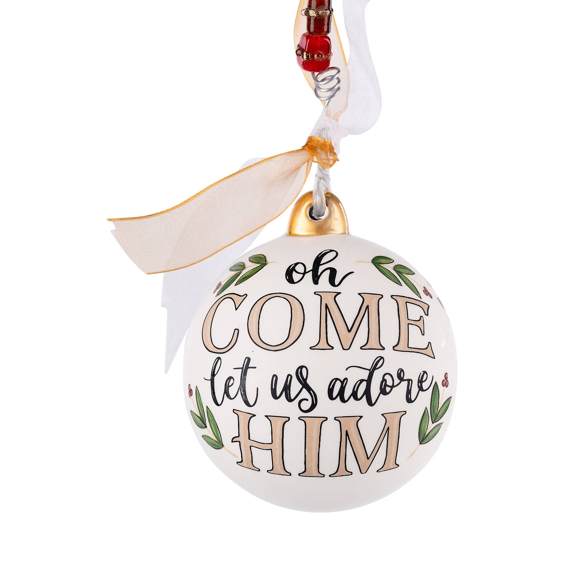 Simple and sweet, this ornament focuses on the reason for the season with a simplistic wreath circling the baby Jesus. A golden star points to the savior and the miracle his arrival brings. "Oh Come Let Us Adore Him" is inscribed on the back in beautiful lettering!  Original Design Our individually hand-painted ceramic ornaments make the perfect addition to a tree bringing high quality artwork with timeless designs to your home. Each new year brings new ornament designs making our ornaments perfect for gifting or collecting. Each ornament comes boxed in our specially designed packaging that allows for easy and safe storage.