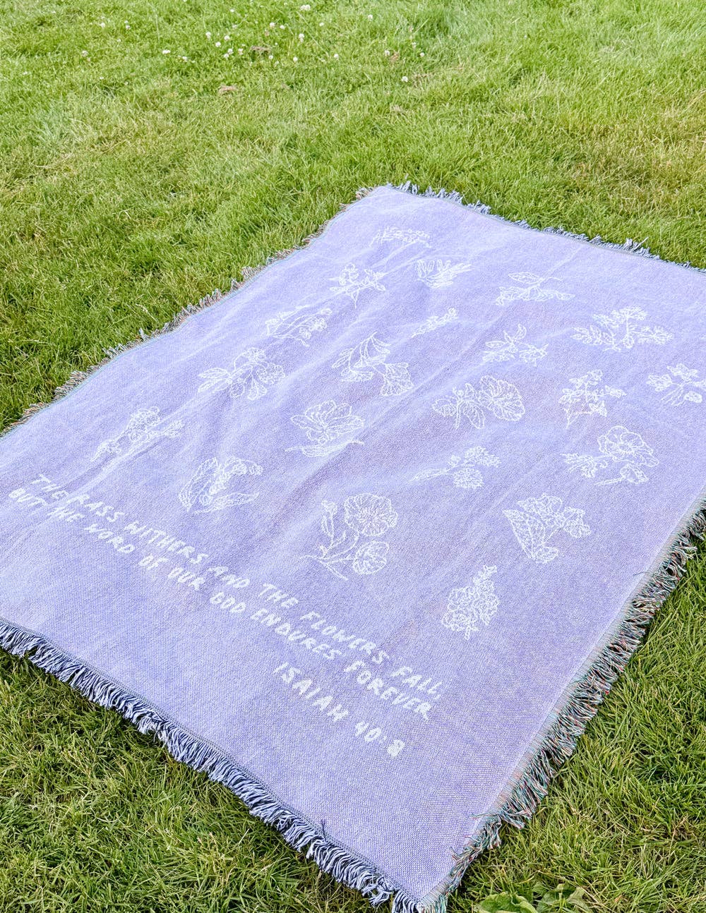 Level up your lounge days with our Wildflower Throw Blanket. With its unique message woven into the design, this throw will keep you cozy and comforted while journaling or slowing down this season. “The grass withers and the flowers fall, but the word of our God endures forever.” -Isaiah 40:8 * 95% Polyester, 5% Cotton * 50"x70" * Jacquard woven * Tassel edges