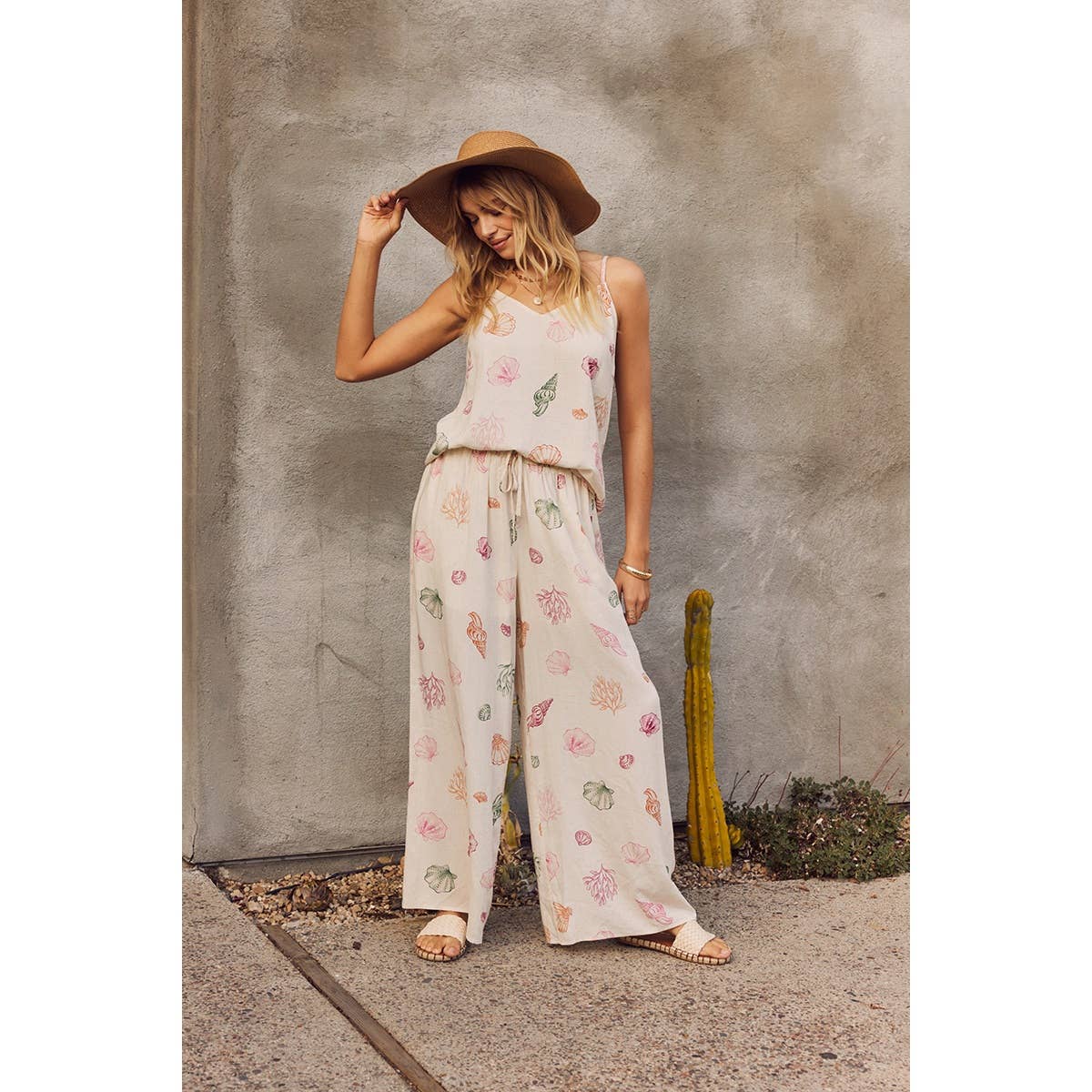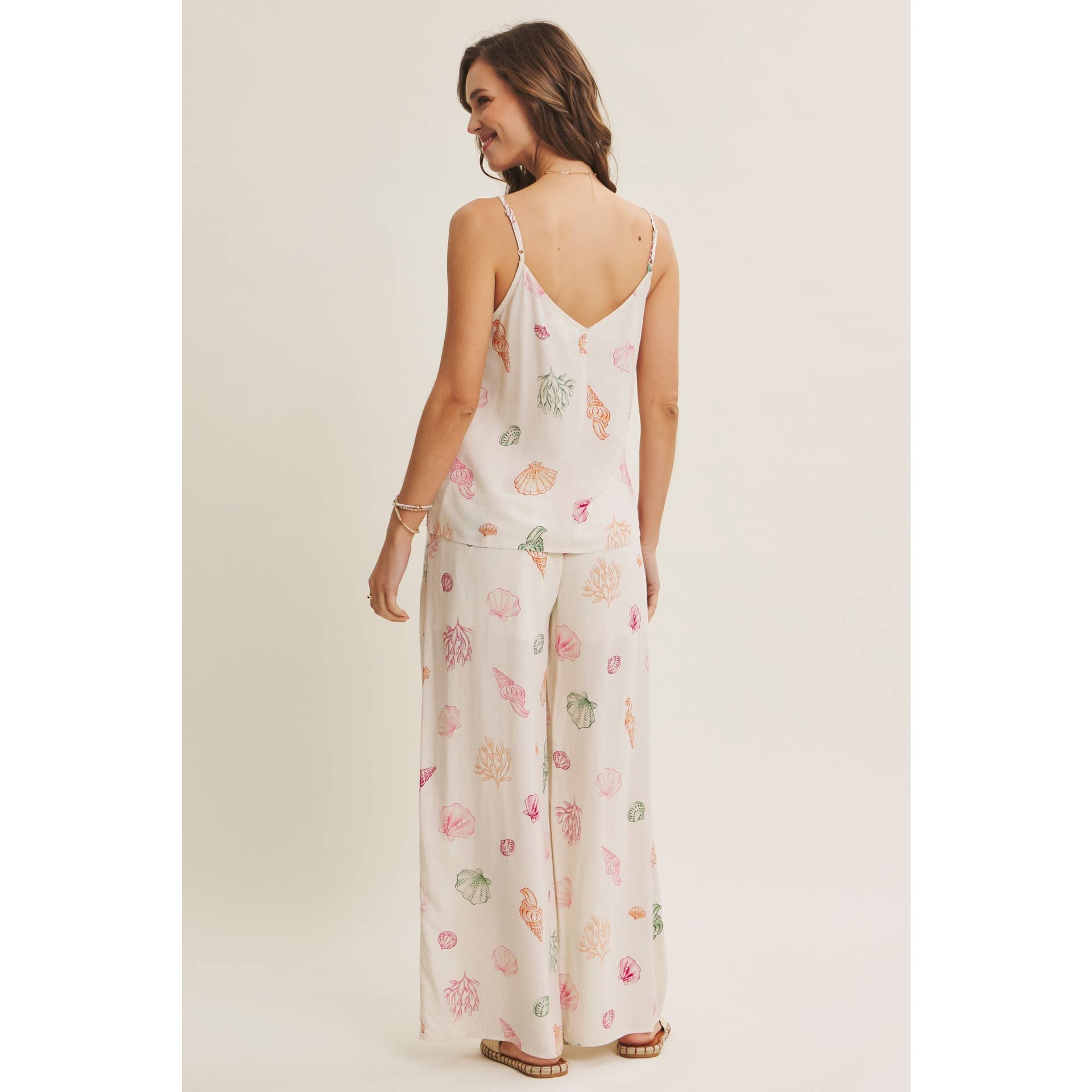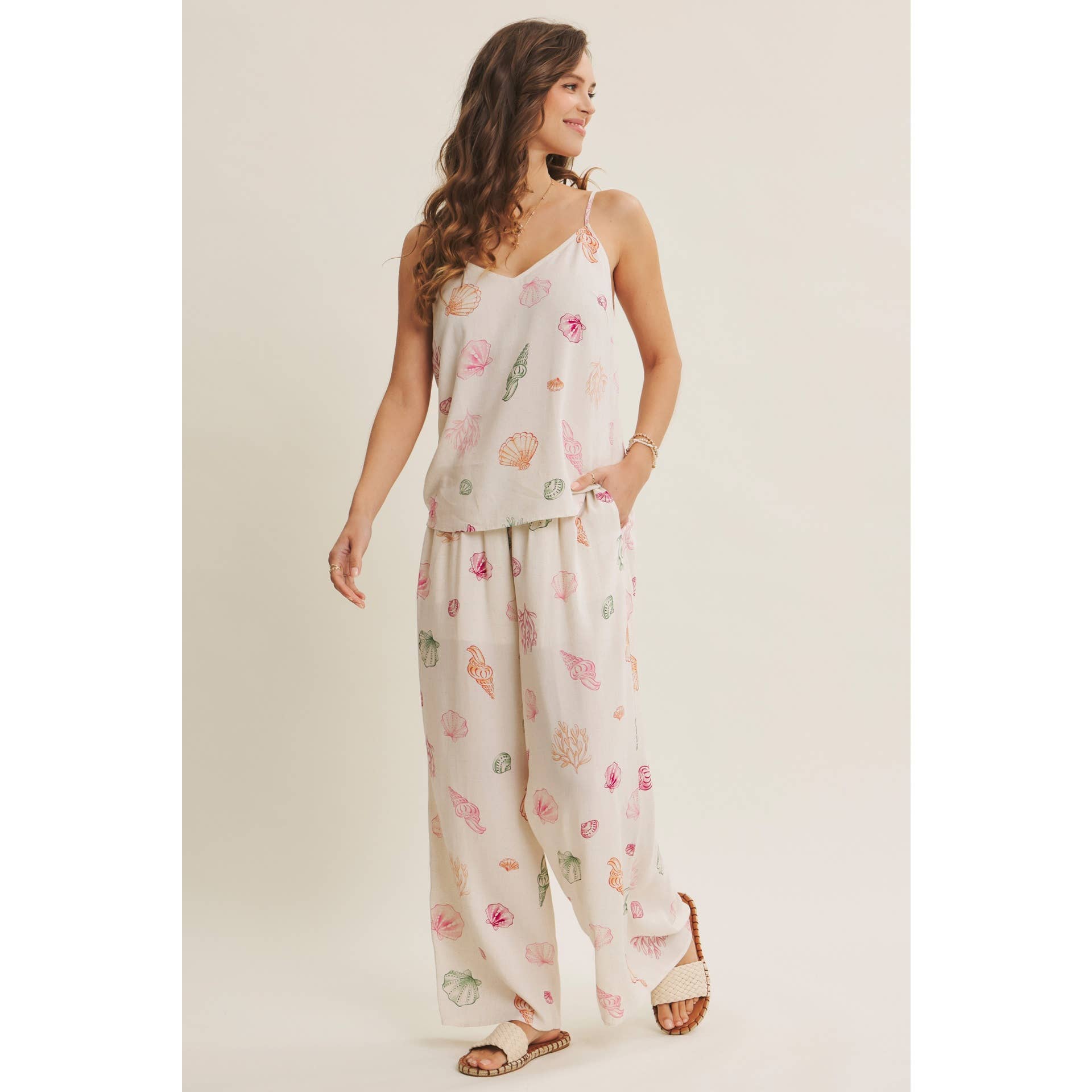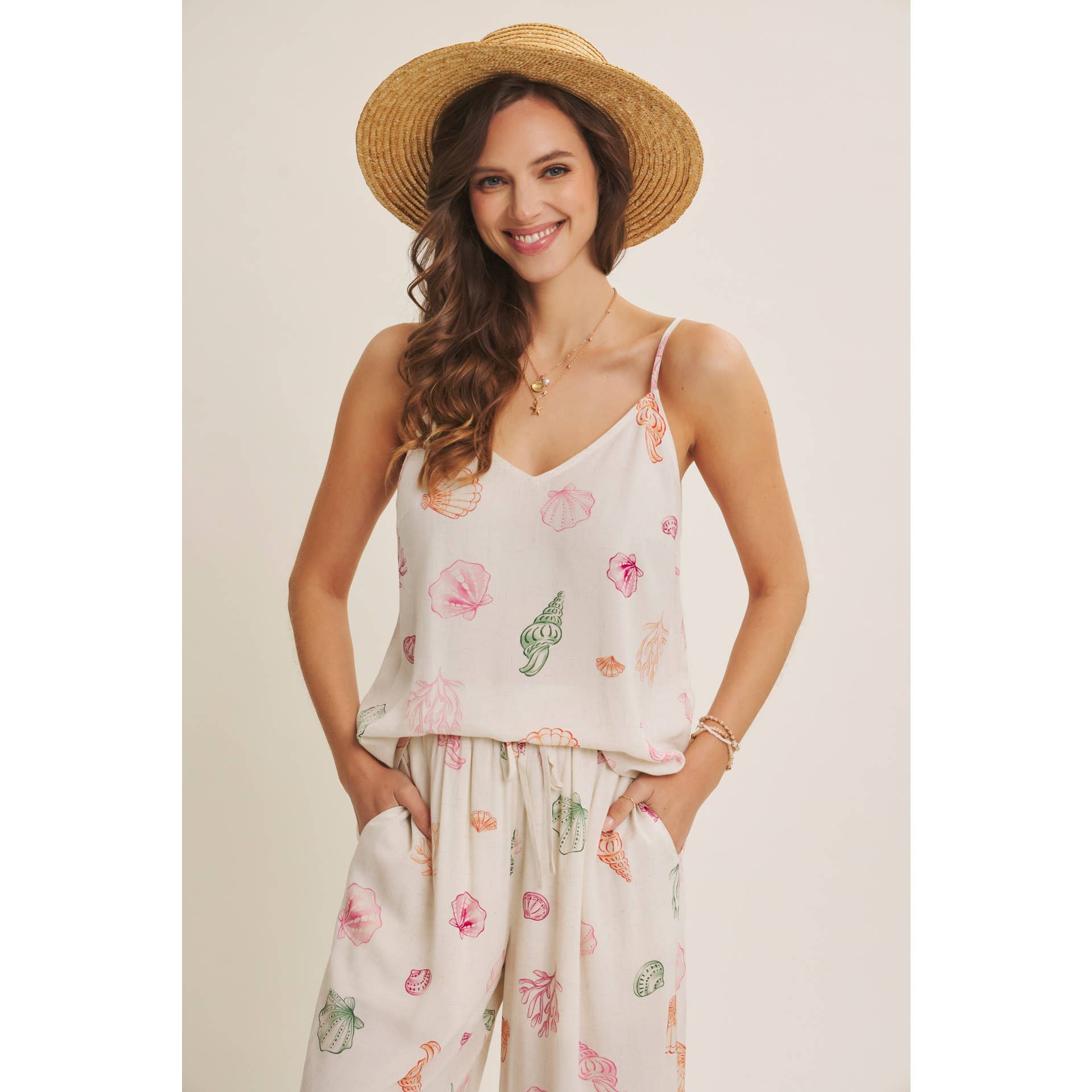 This sleeveless seashell cami top brings a fresh, beach-inspired mood with its delicate coastal print and airy silhouette. Designed with a flattering V-neckline and adjustable spaghetti straps, it’s an easy piece that feels both relaxed and refined. Made from a lightweight rayon-cotton blend, this top drapes softly and stays comfortable even on the warmest days. The clean, minimal shape makes it perfect for tucking into denim, pairing with tailored shorts, or styling with the matching seashell pants for a complete resort-ready look. Whether worn on its own or layered under a light cardigan, this cami is an effortless summer essential. Perfect for vacations, brunch dates, and everyday sunshine dressing.
