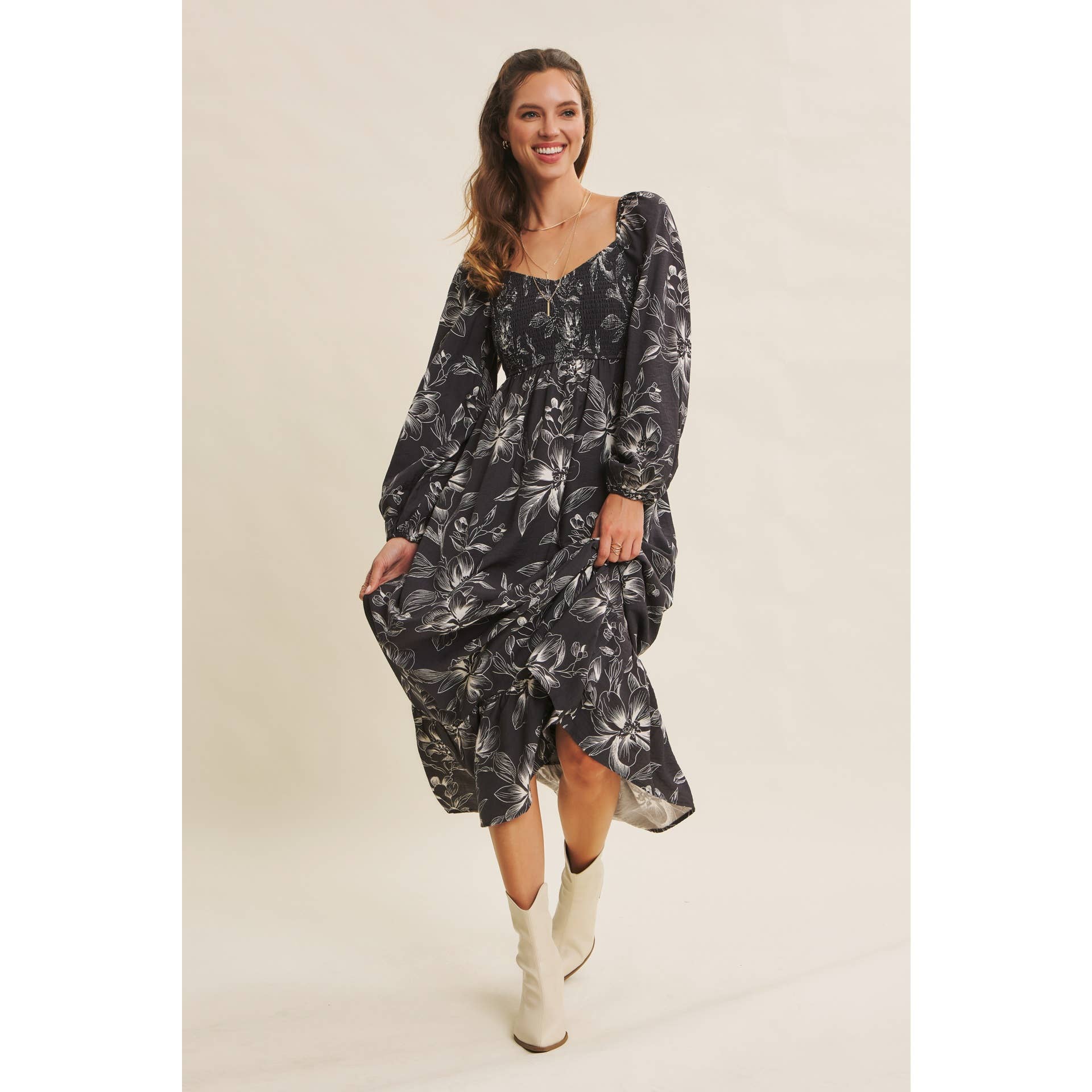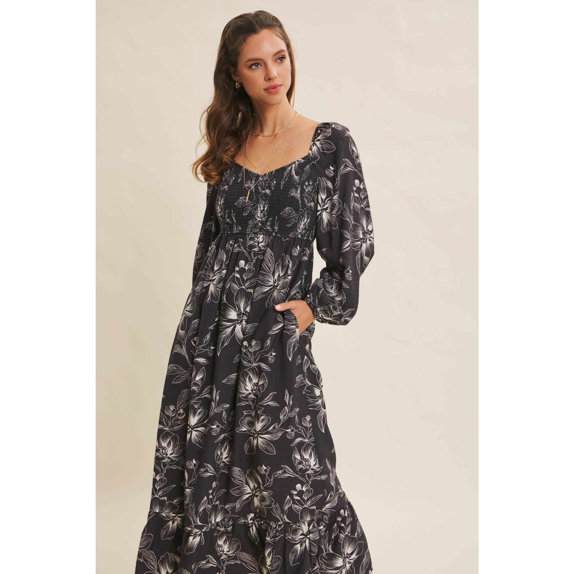 An effortless blend of elegance and romantic charm, this maxi dress is a true wardrobe staple for FW and beyond. Featuring a smocked bust that offers both structure and stretch, it flatters the silhouette while allowing room for comfort—making it post bump and maternity friendly. The sweetheart neckline adds a soft feminine touch, balanced by billowy balloon sleeves and a ruffled hem that sways with every step. Whether you're headed to a cozy fall picnic, capturing timeless family photos, or simply stepping out for brunch, this dress moves with you in style. It's the kind of dress that makes you feel instantly put together. For retailers looking to stock an elevated everyday piece that translates across seasons—this is it. Features - Smocked bust - Sweetheart neck - Floral maxi dress - Ruffled hem - Back square neck - Flowy - Pockets - Long balloon sleeves Size + Fit Model is 5'9.5" and wearing a size Small