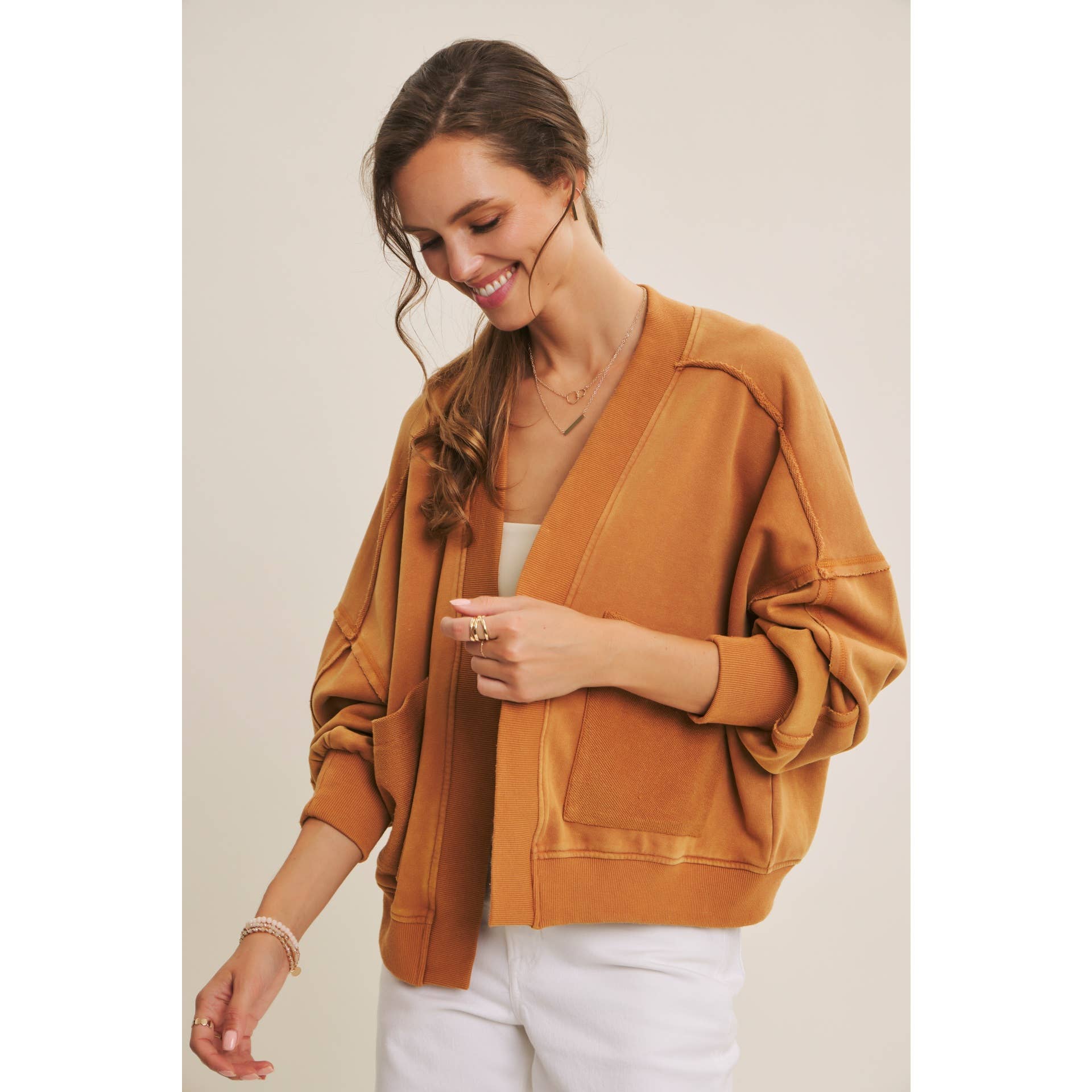 A cozy favorite, reimagined in our signature mineral-washed finish. This oversized French terry cardigan combines comfort with thoughtful design, from the soft drape of the open front to the voluminous balloon sleeves and utility-inspired pockets. Contrast paneling and exposed seam details add subtle texture and dimension, making it more than just a basic layer. Perfect for layering over anything from tanks to turtlenecks, it’s an effortless go-to whether you’re heading to the studio, the farmer’s market, or a laid-back workday. Available in colorways that naturally faded to perfection. Relaxed, practical, and undeniably soft. This is the cardigan they'll live in. Features - Mineral-washed - Oversized - French terry fabric - Open front cardigan - Long balloon sleeves - Exposed seams - Pockets - Fabric mix Size + Fit Model is 5'9.5" and wearing a size Small Please refer to our size chart.