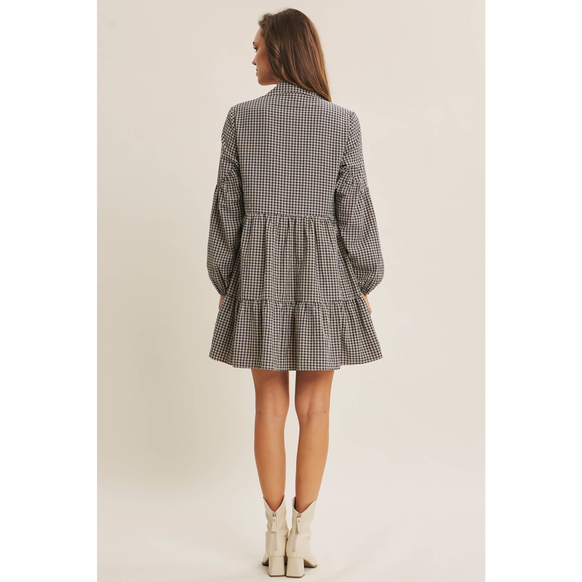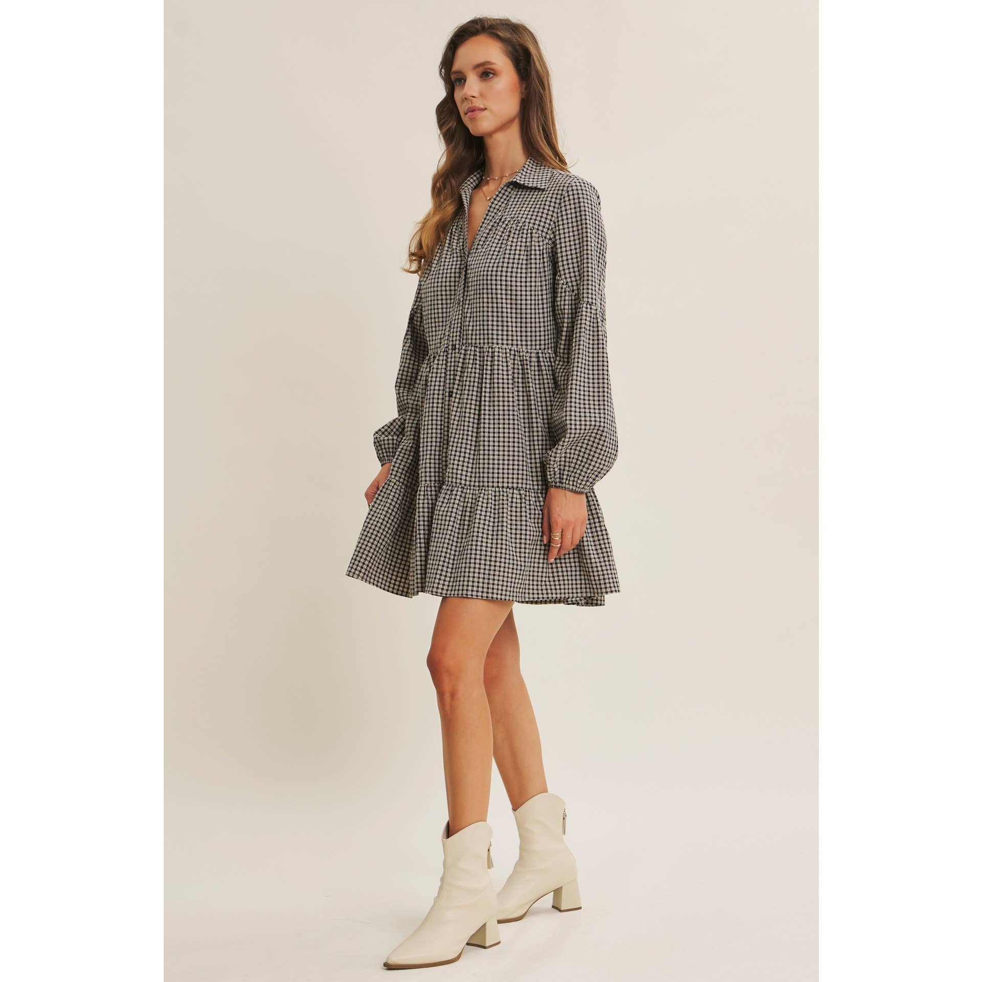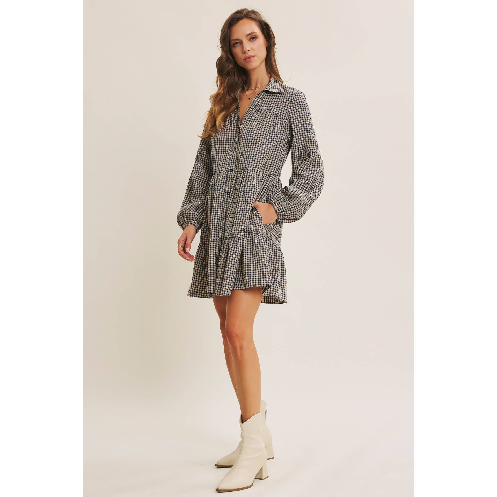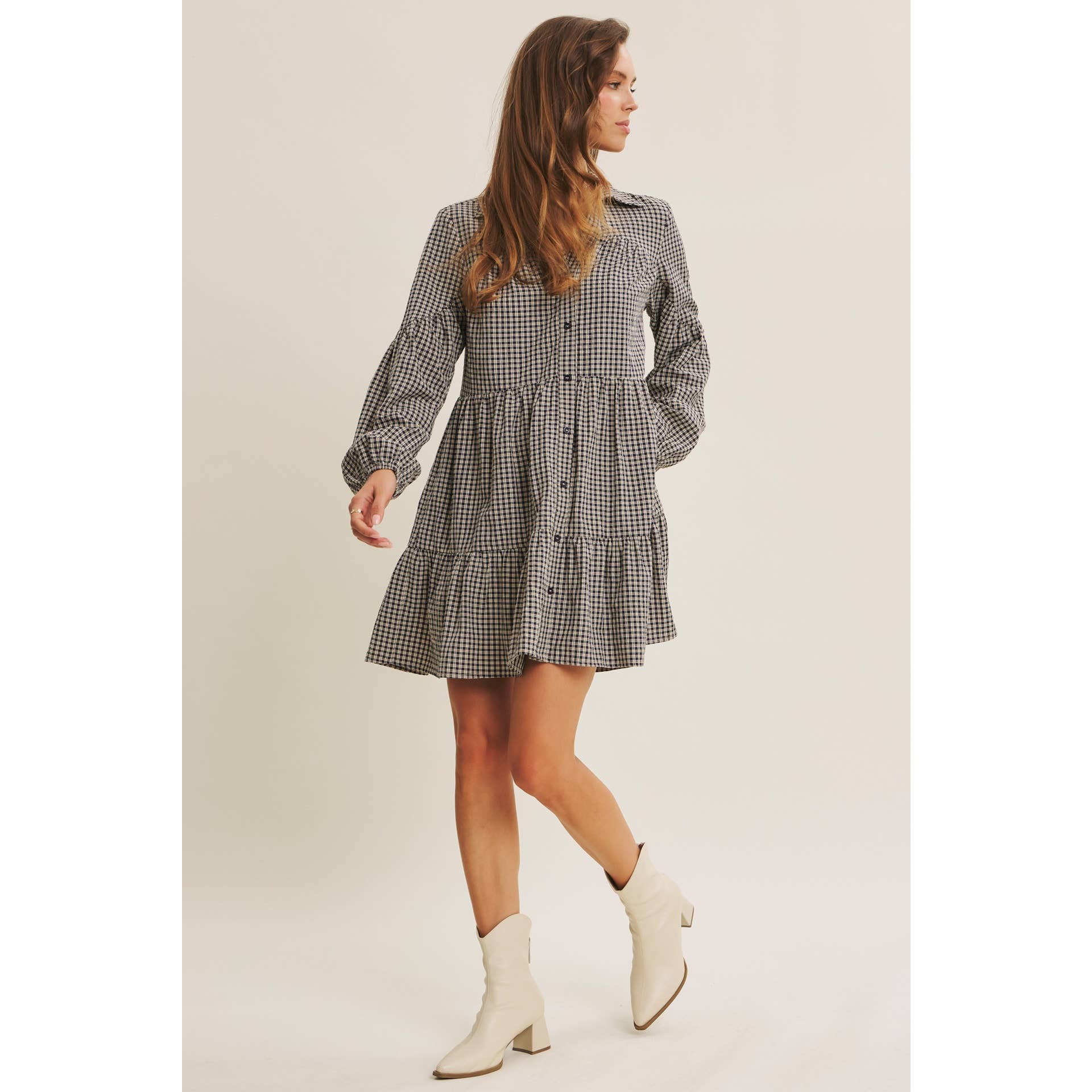 Easy to wear, effortless to love. This plaid mini dress brings a fresh yet timeless countryside mood with a hint of attitude. Just pair with black boots and a velvet choker for instant chic. Featuring tiered ruffles, subtle balloon sleeves, and a flattering collared neckline, this babydoll silhouette offers freedom and softness without compromising on style. It’s lined, includes side pockets (yes, pockets!), and buttons all the way down for easy wear. The soft cotton-blend fabric adds comfort for long days, while the structure keeps it polished enough for casual workdays, coffee dates, or weekend outings. Whether you’re dressing it up with booties or going comfy with flats and a cardigan, this is the throw-on-and-go piece your customers will reach for all season. Seasonal ease with everyday charm. Features - Tiered ruffles - Babydoll - Mini dress - Side pockets - Lined - Collared v-neckline - Long balloon sleeves - Button-down Size + Fit Model is 5'9.5".