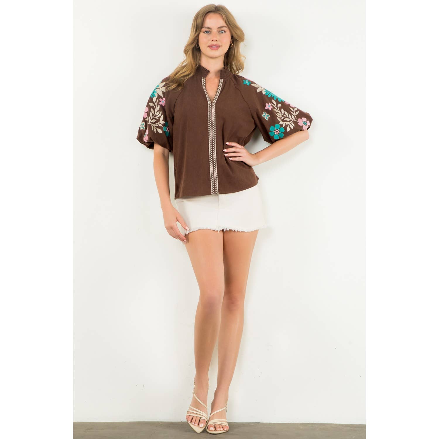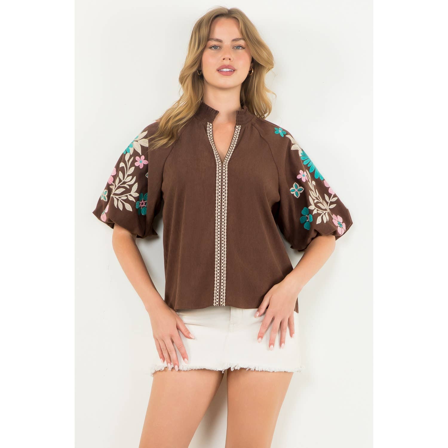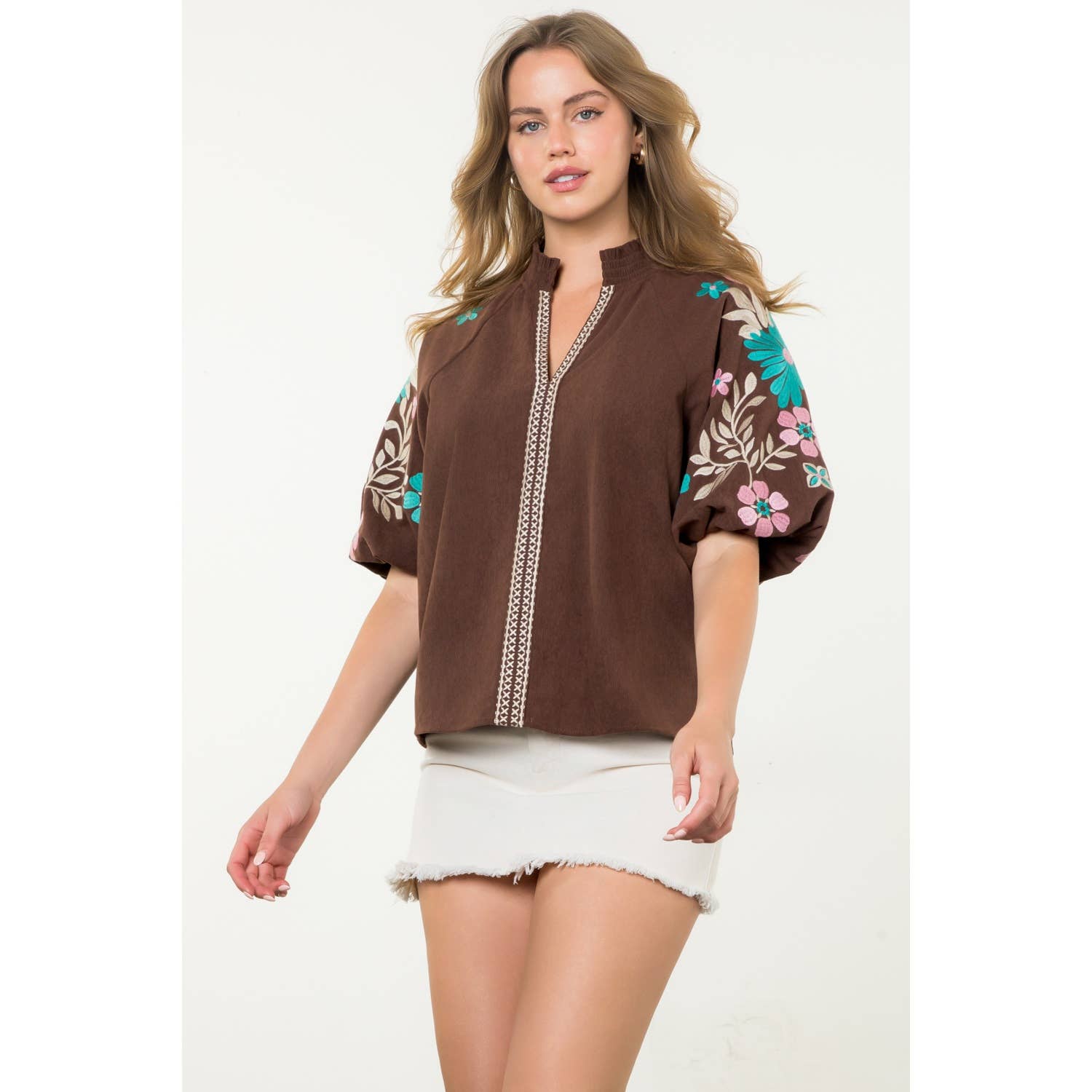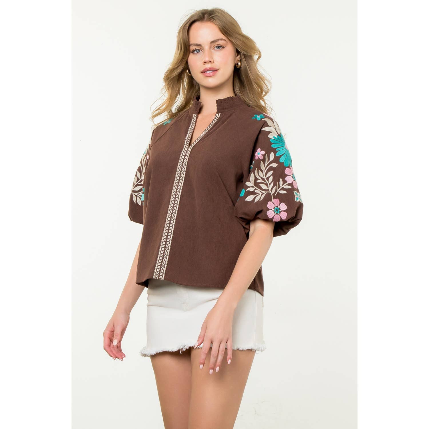 Embroidered Puff Sleeve Corduroy Top . / Style Measurements for Size S / Designed in USA - Body Length: 24 in - Bust Width: 40 in - Sleeve Length: 16 1/2 in . / Model Sizes - Wearing Size S - Height 5' 9", Bust 32", Waist 25 1/2", Hips 36" . / Prepack Contents - In a Pack of XS(1), S(2), M(2), and L(1) per Color Only . / Fabric Content - WOVEN / 80% Polyester, 20% Viscose