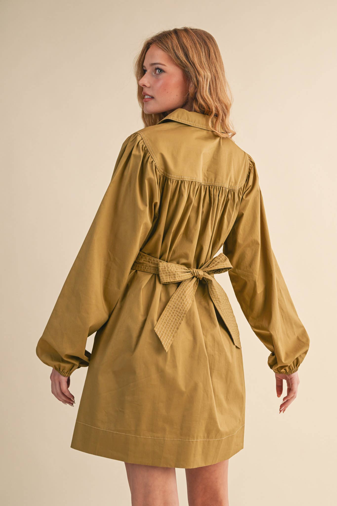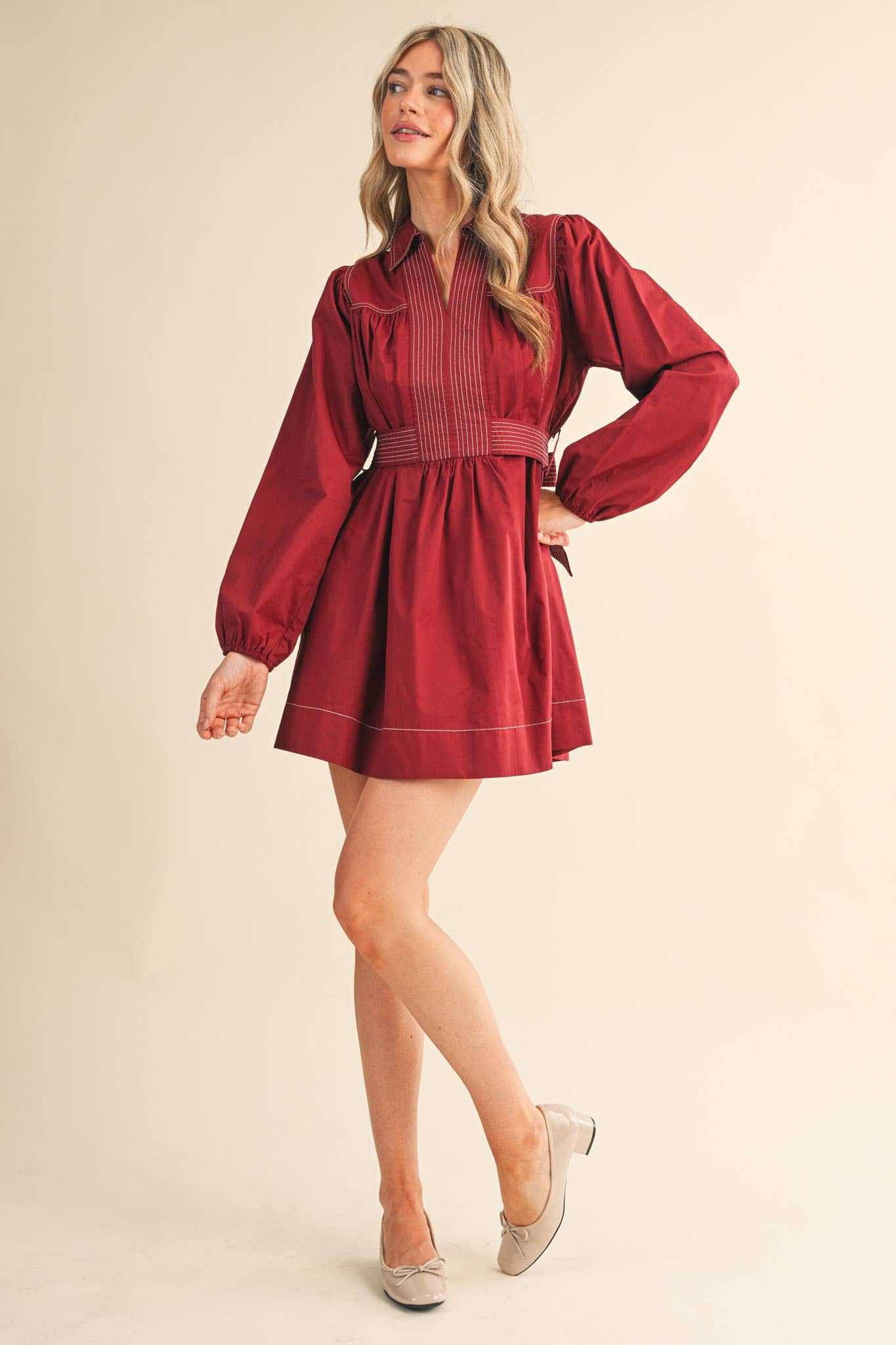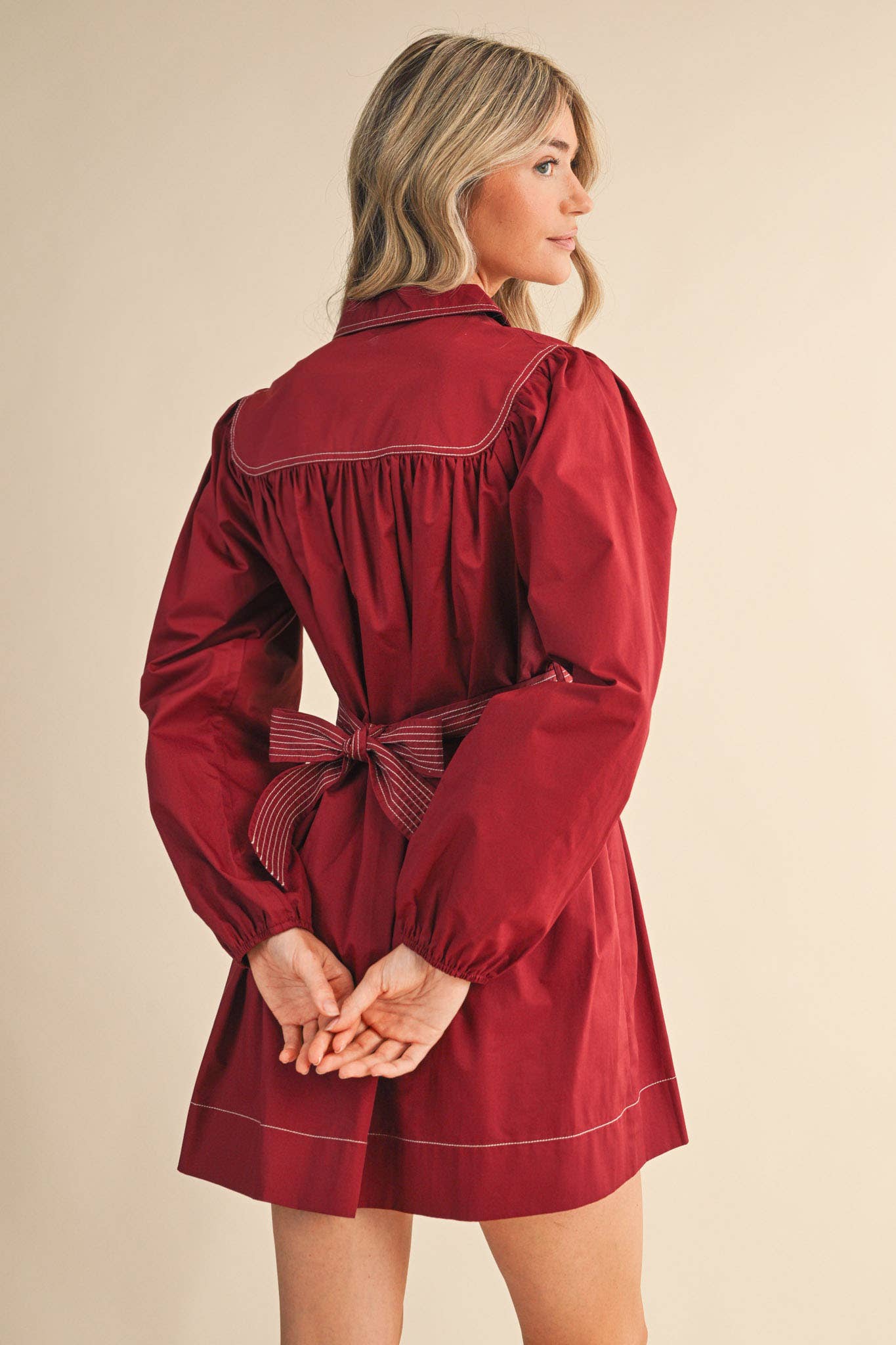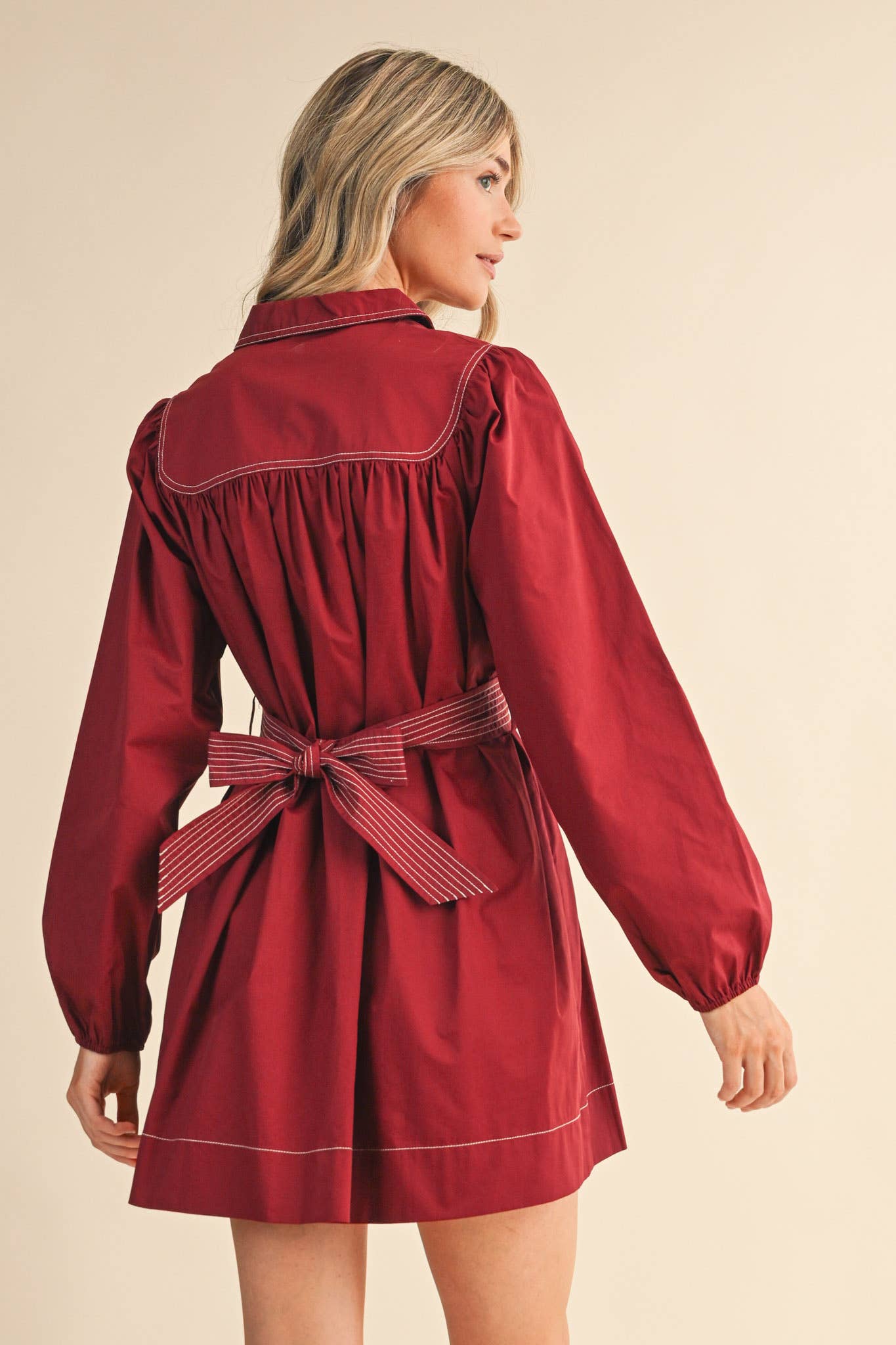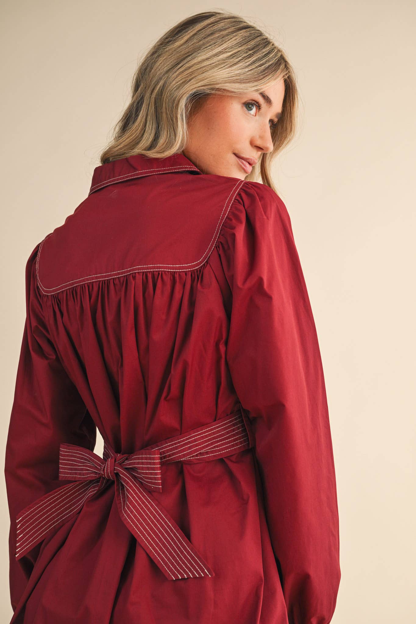 + Attached tie-back bow belt with contrast embroidered seam detail