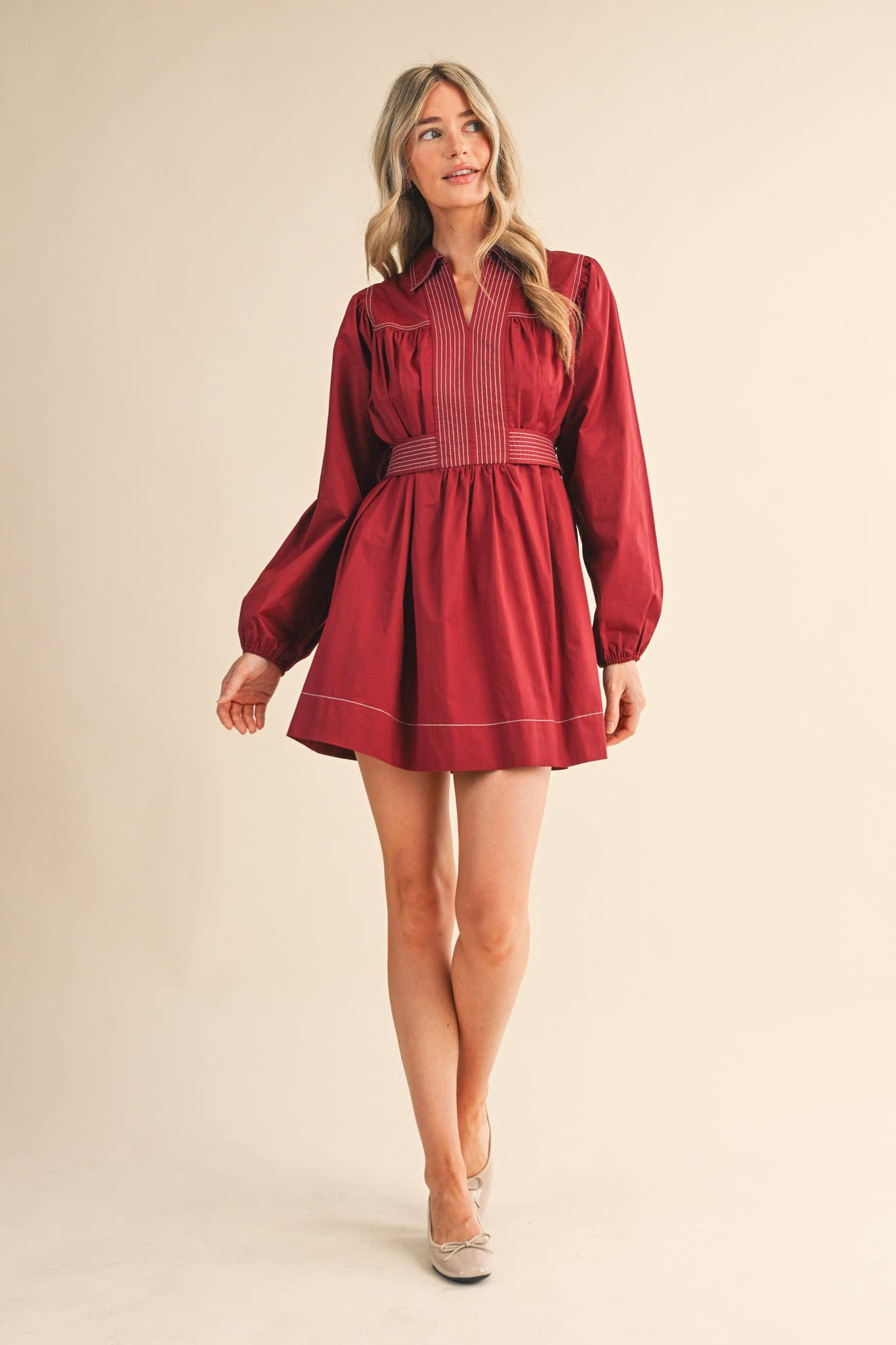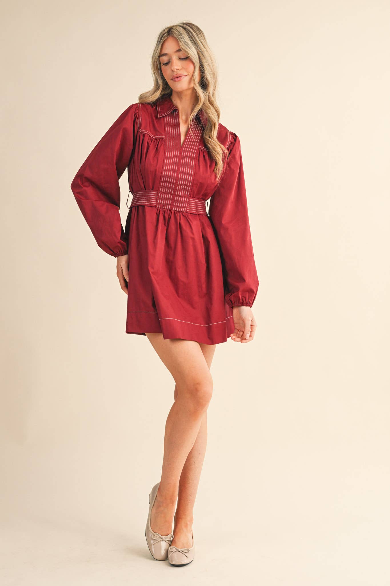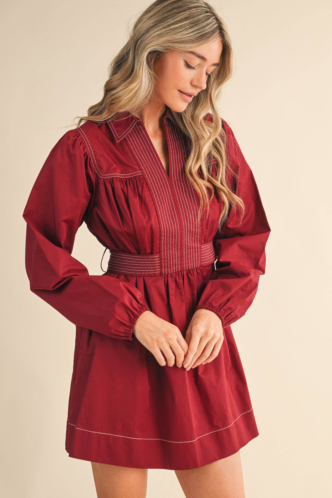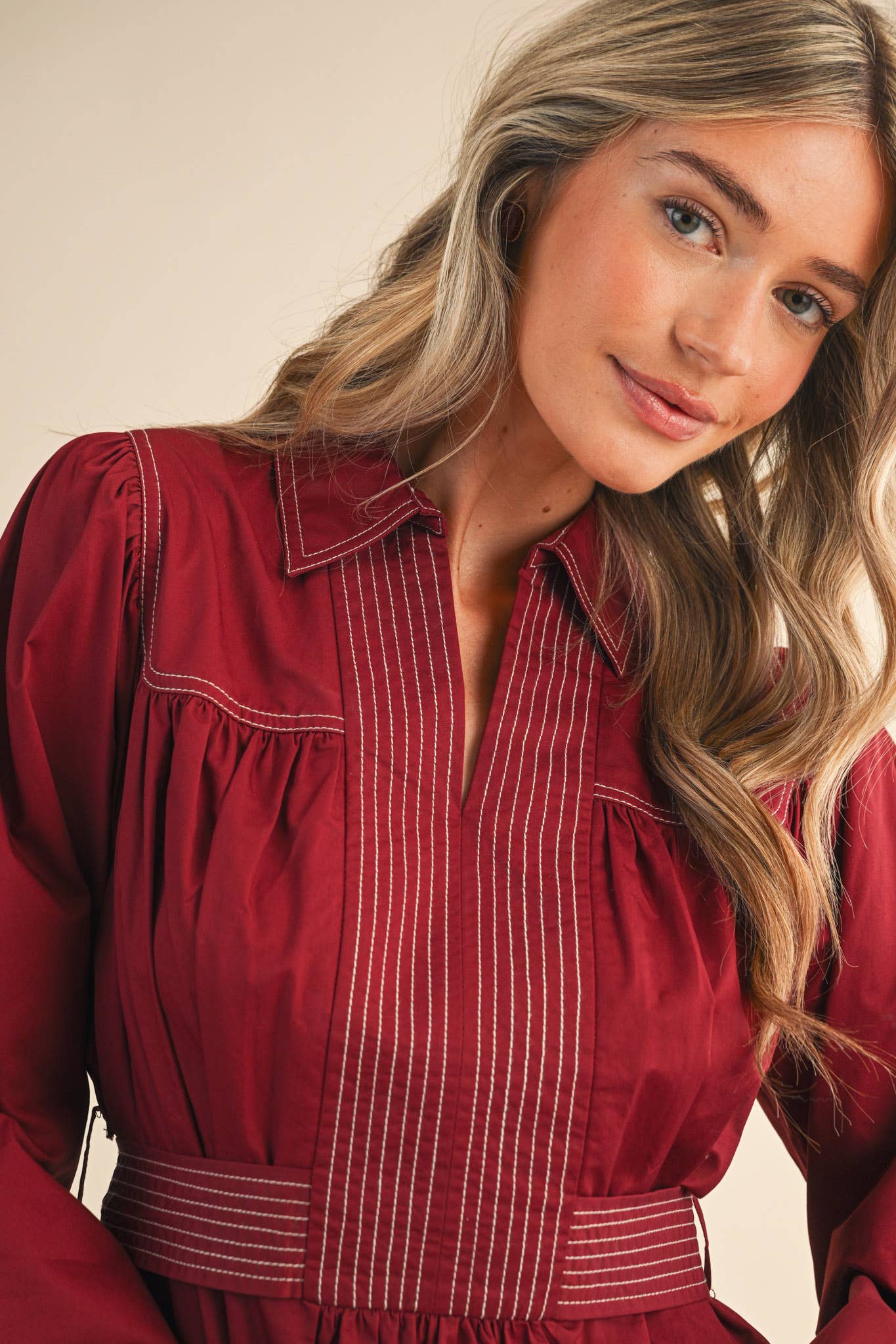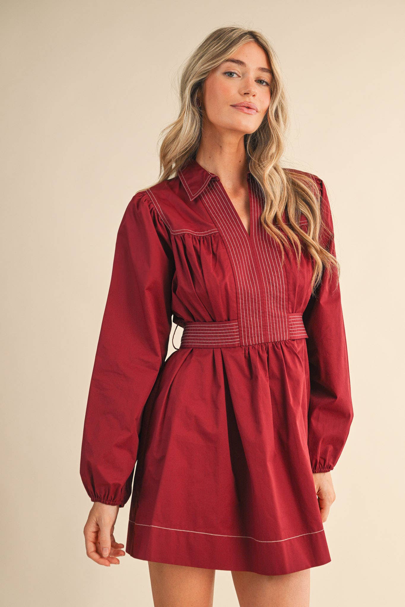 + Attached tie-back bow belt with contrast embroidered seam detail
