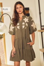 Tiered mini dress with oversized floral applique embroidery, split neckline, and puff sleeves.