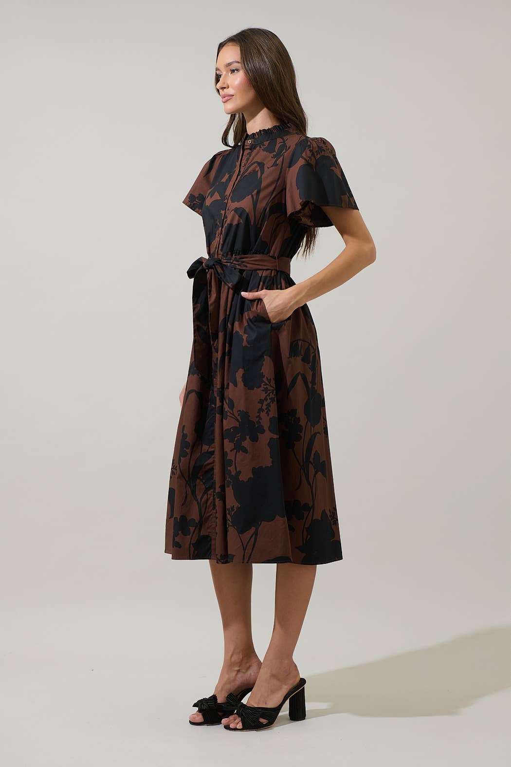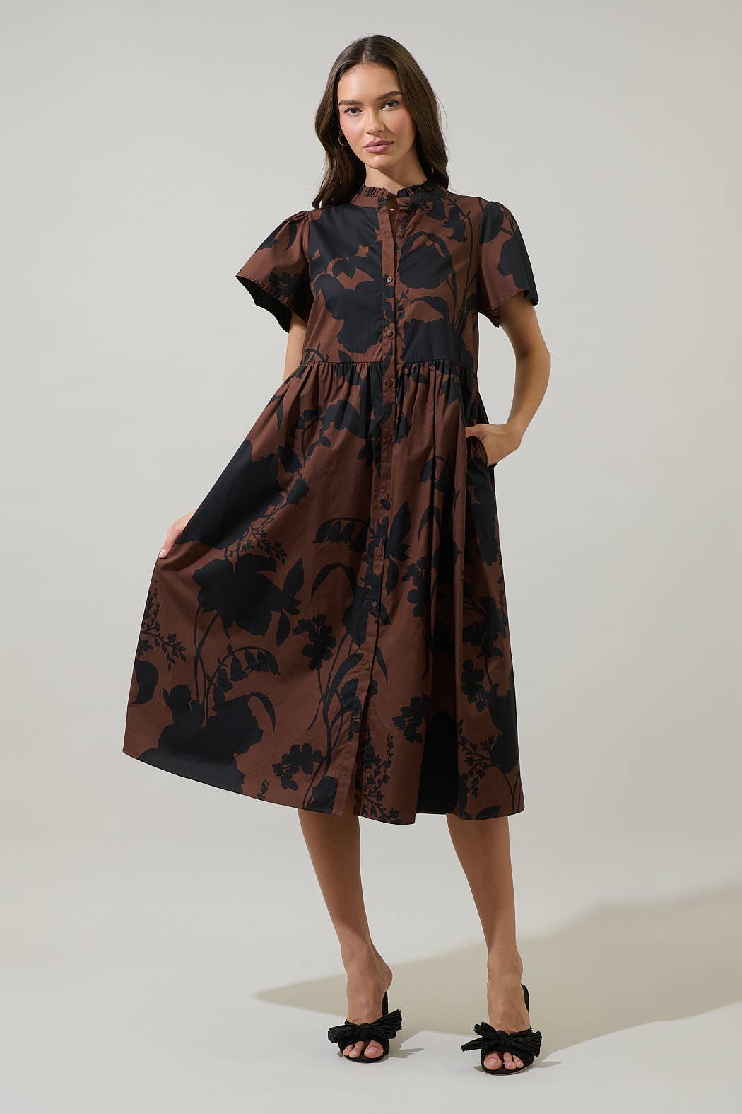 Sweet and stylish come together to form the Somerton Floral Aurelia Babydoll Midi Dress. It forms a mock neck with button up closure detail from top to bottom, and short sleeves. A belt around the waist tops a flowy skirt that flows to a modest midi length. Pair with any shoes of your choice and simple accessories.