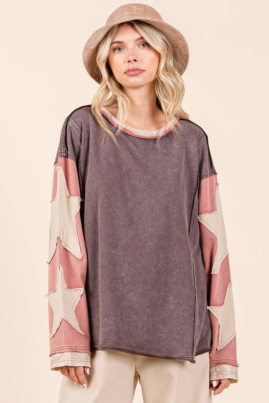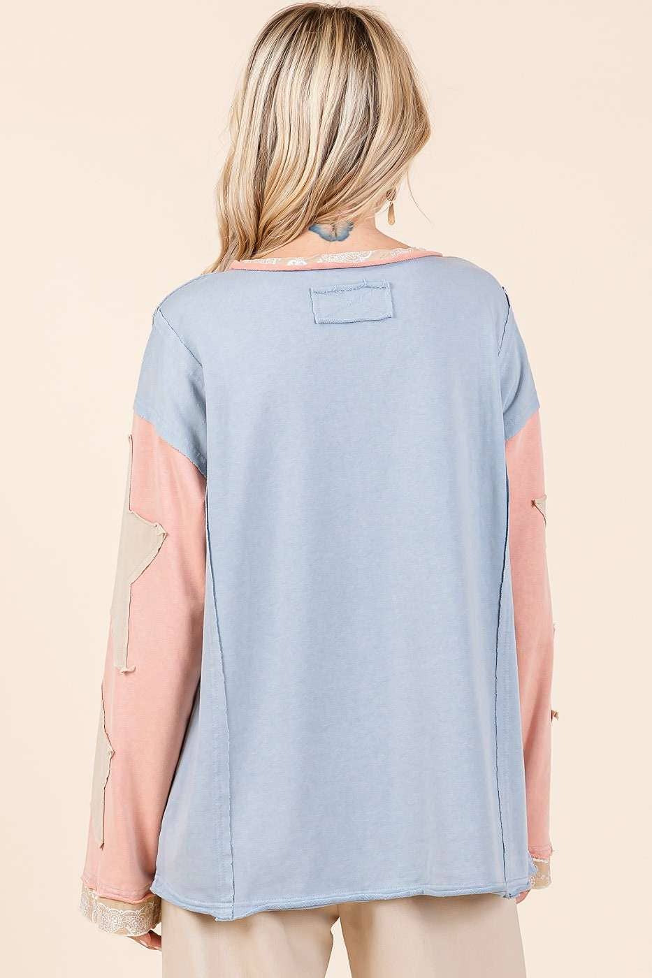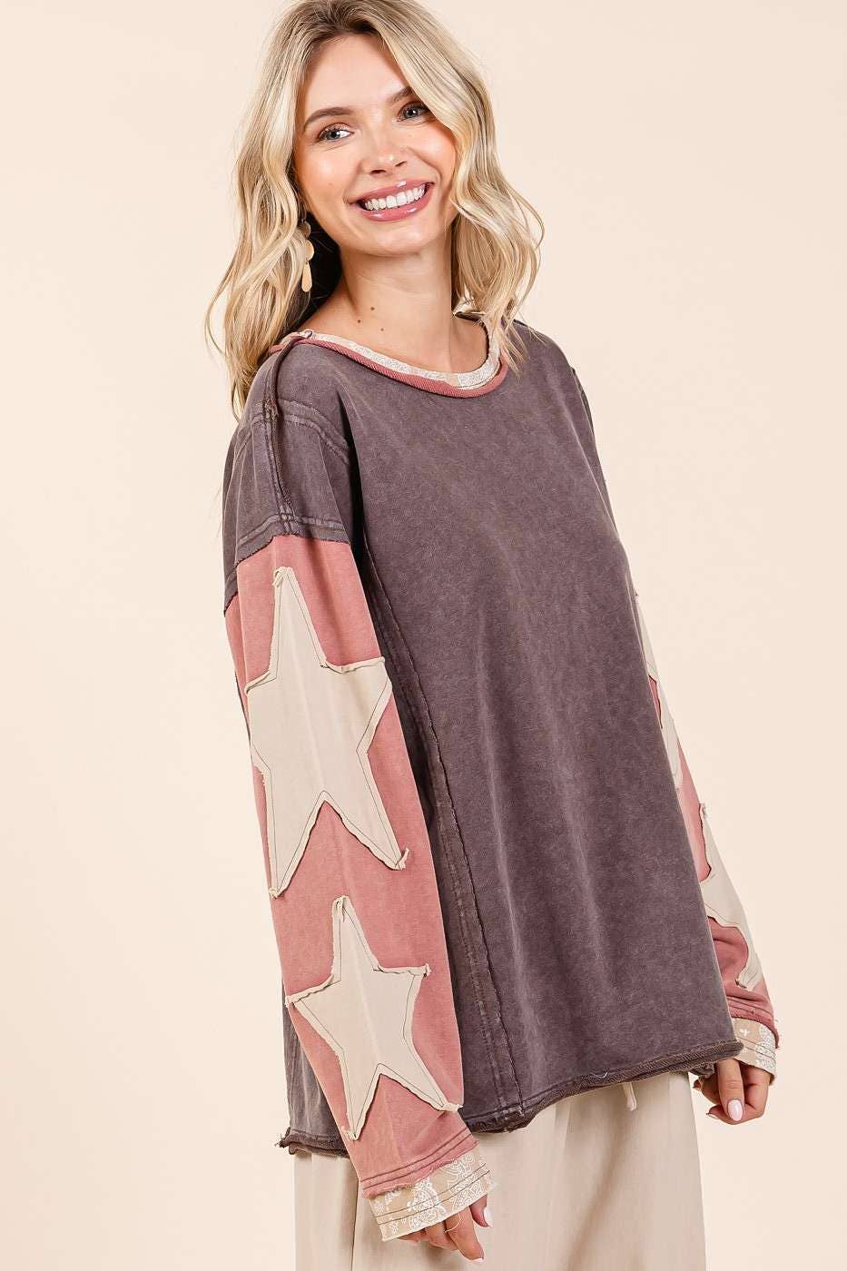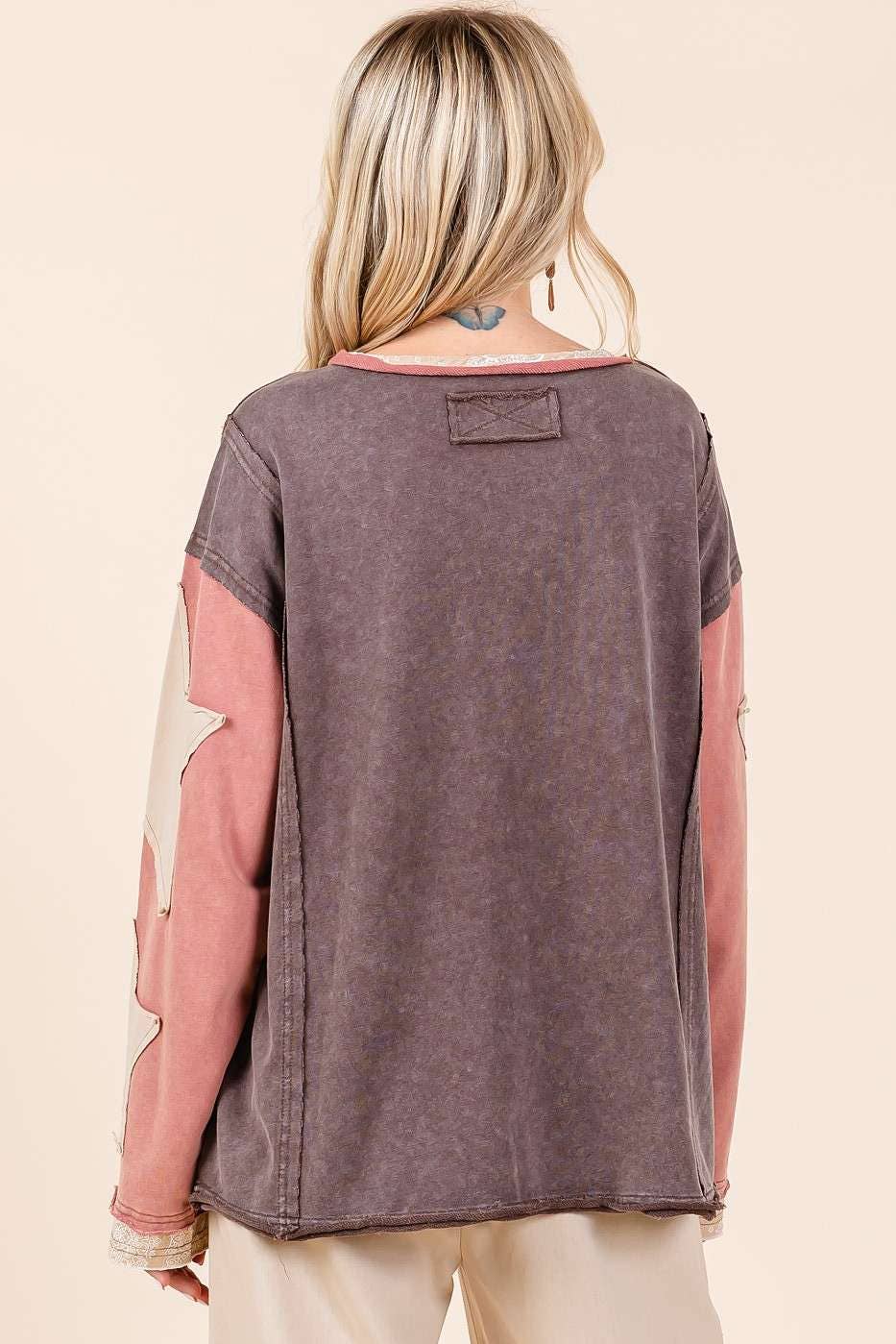 # fall, winter, top, tee, long sleeve tee, star patchwork, colorblock, mineral washed, long sleeve, raw hem, loose fit, relaxed fit, multicolor, boho, bohemian, western
