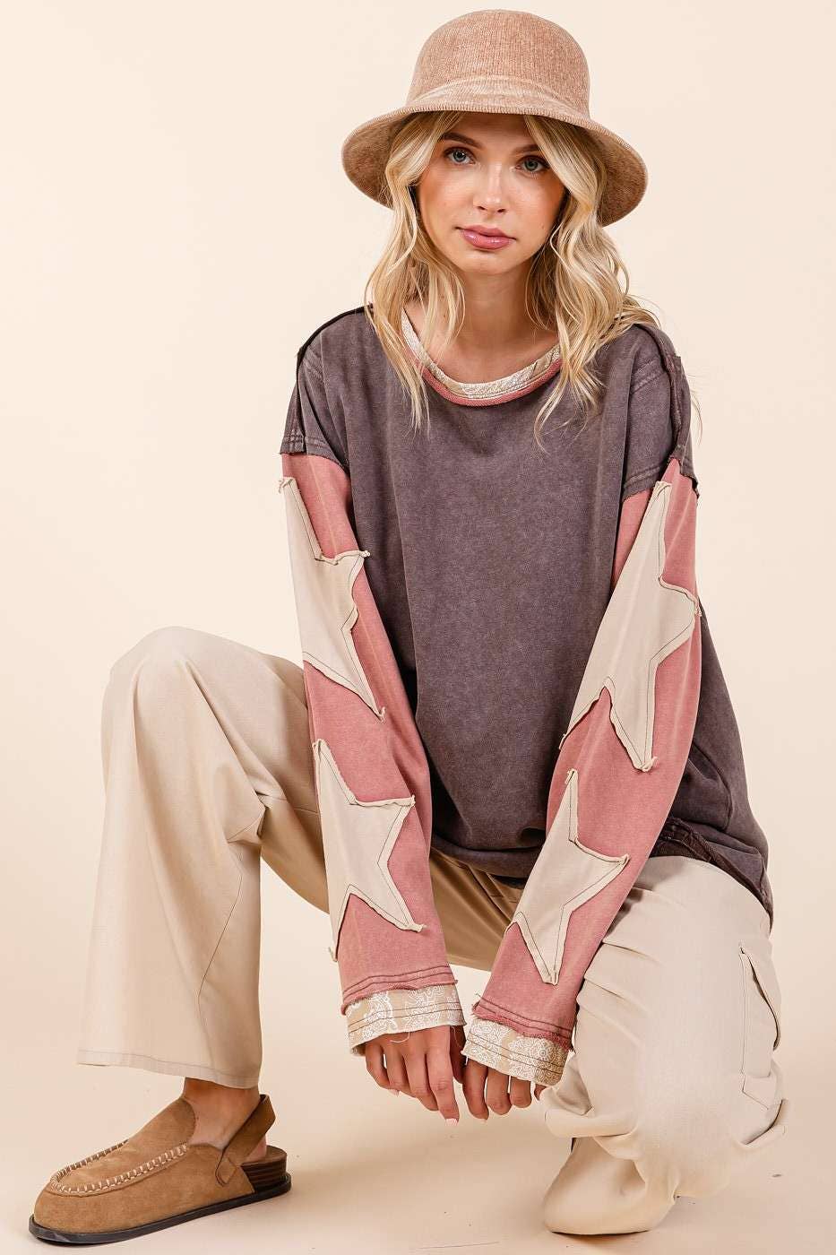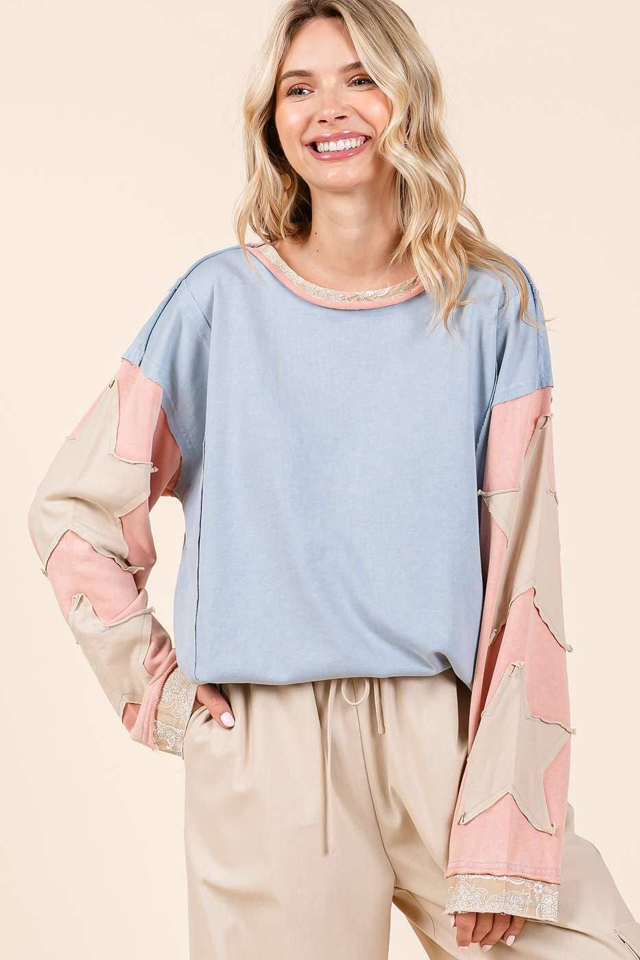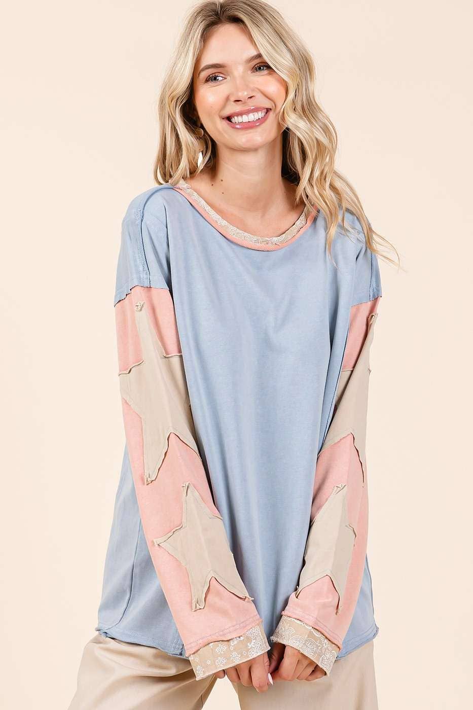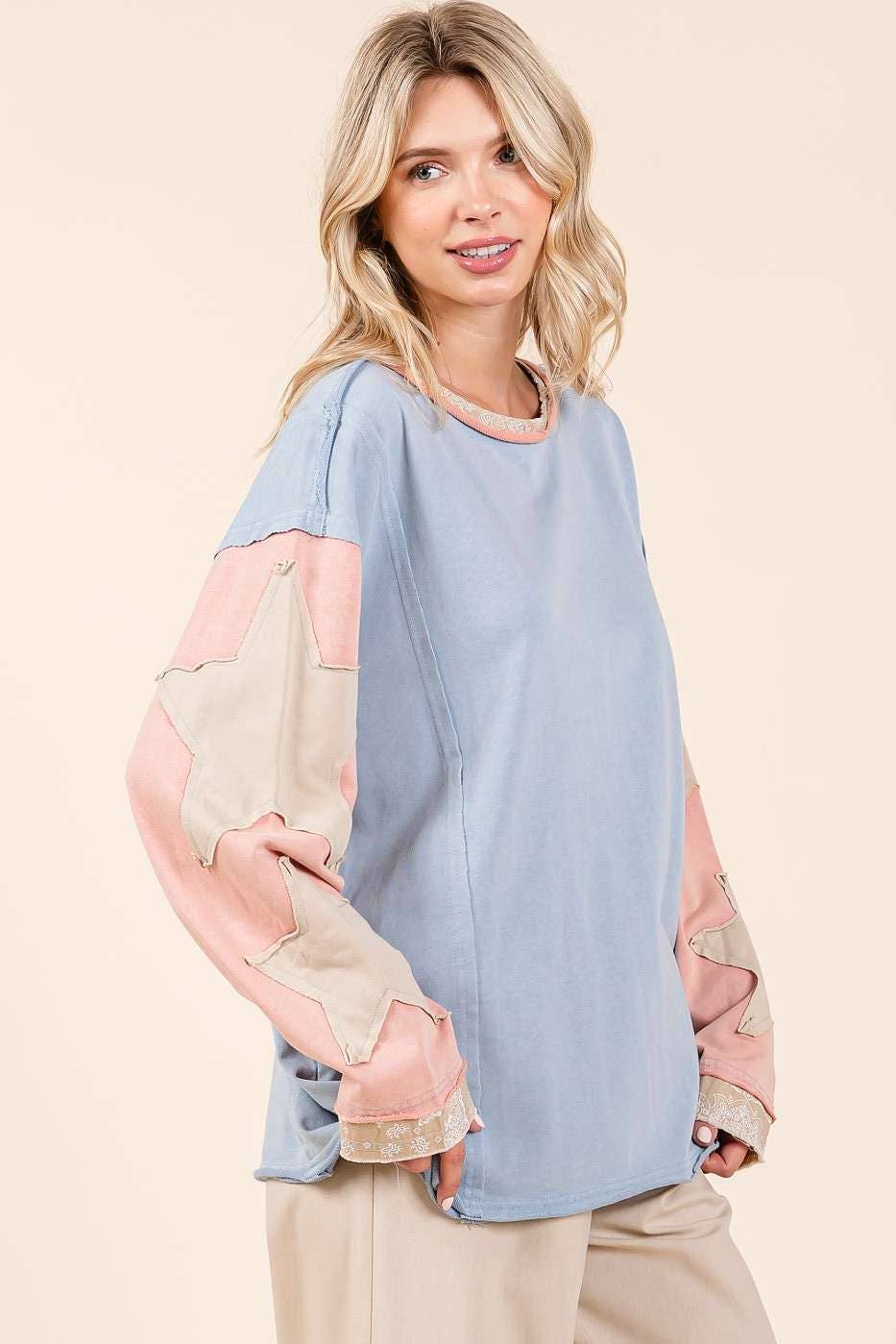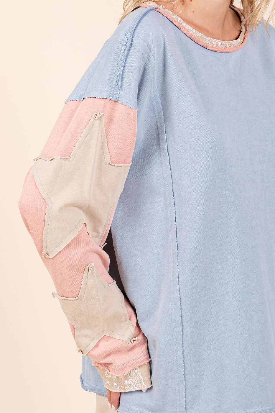 # fall, winter, top, tee, long sleeve tee, star patchwork, colorblock, mineral washed, long sleeve, raw hem, loose fit, relaxed fit, multicolor, boho, bohemian, western