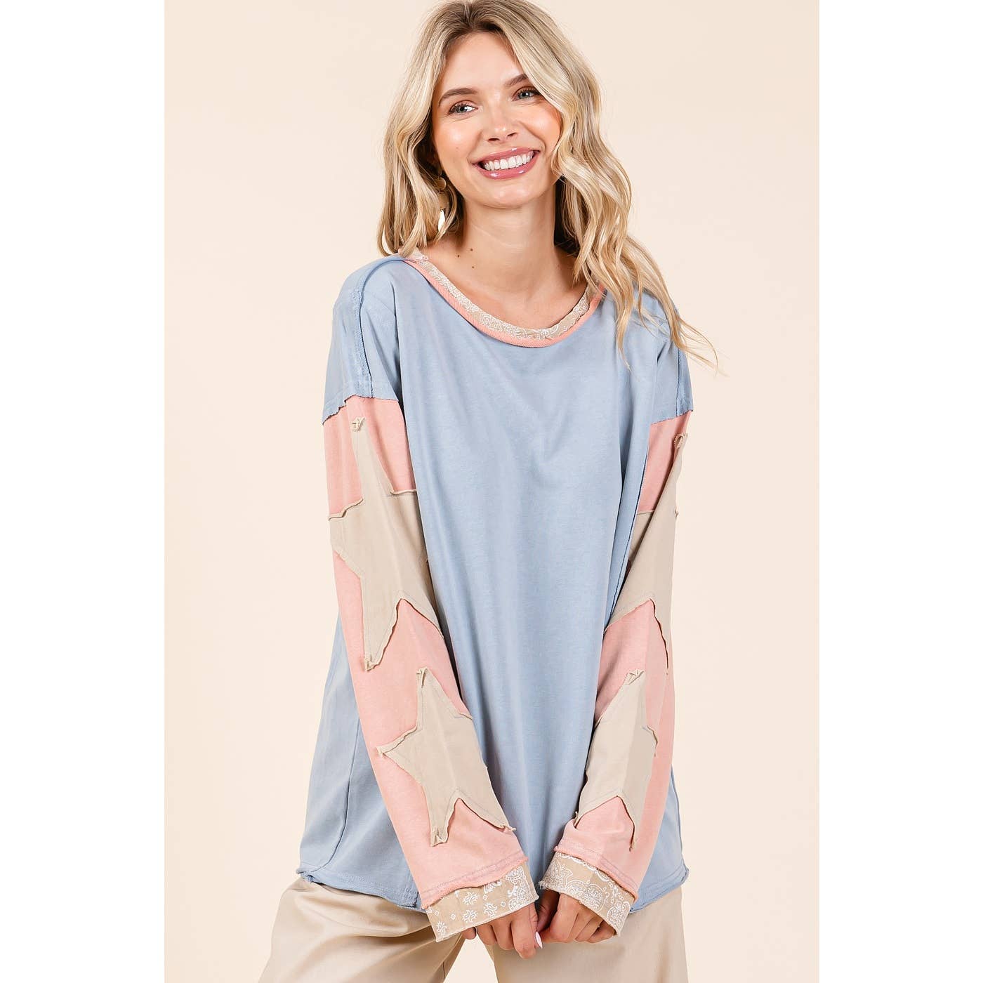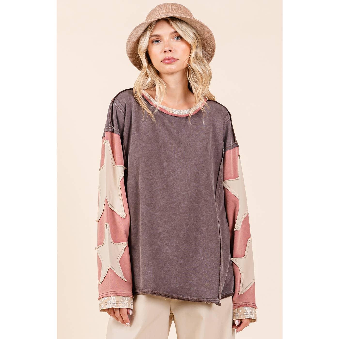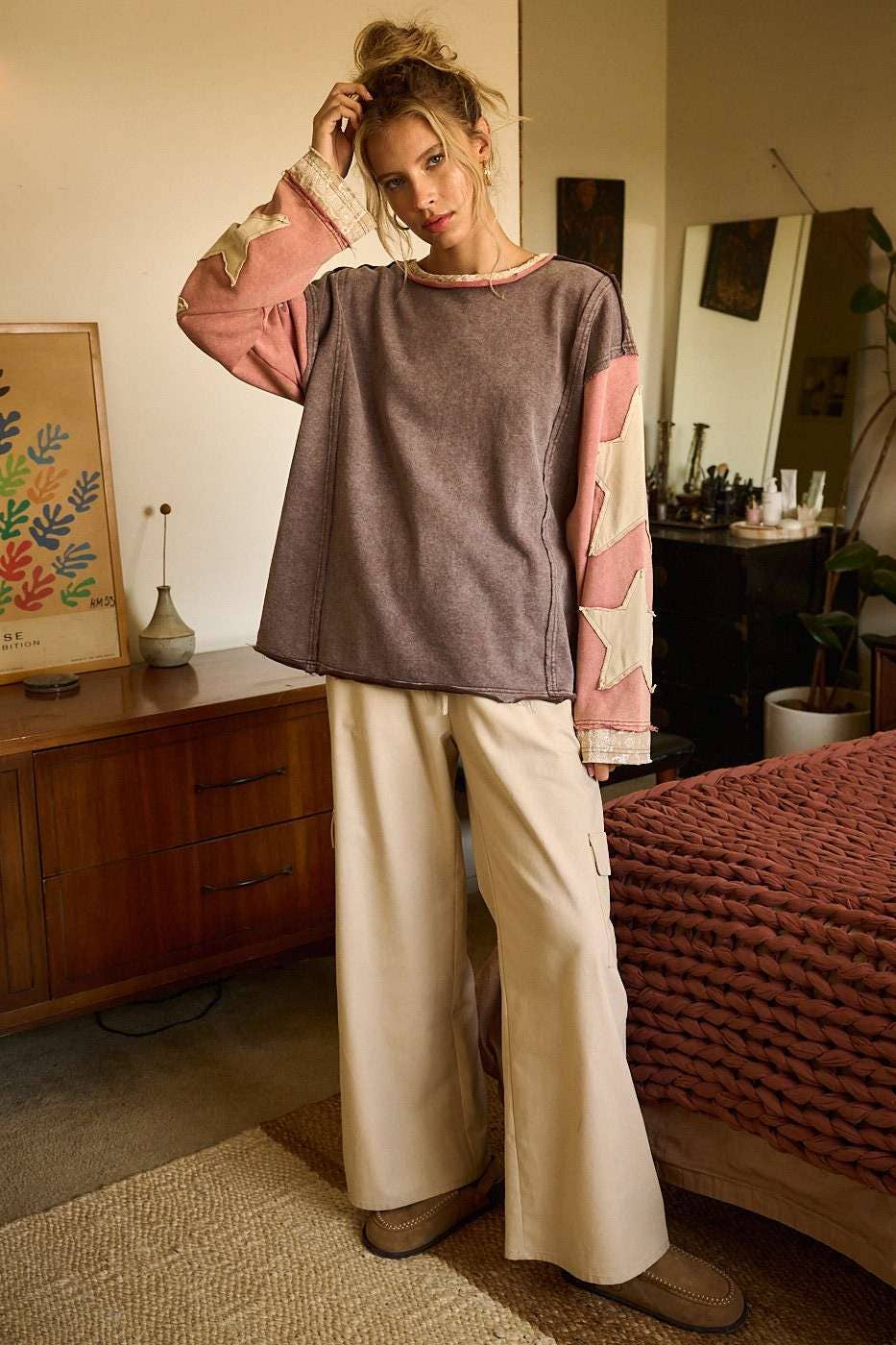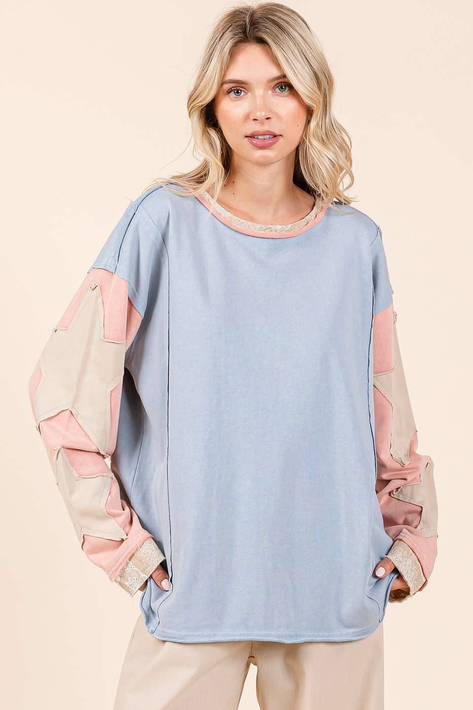 # fall, winter, top, tee, long sleeve tee, star patchwork, colorblock, mineral washed, long sleeve, raw hem, loose fit, relaxed fit, multicolor, boho, bohemian, western